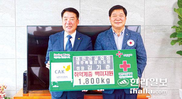 대한건설협회제주특별자치도회(회장 김기춘)는 지난 7일 대한건설협회 회장실에서 대한적십자사제주특별자치도지사(회장 정태근)에 취약계층을 위한 백미 1800㎏을 기탁했다. 이번 물품은 대한건설협회제주도회 회장의 취임식을 축하하기 위해 쌀화환으로 마련됐다.