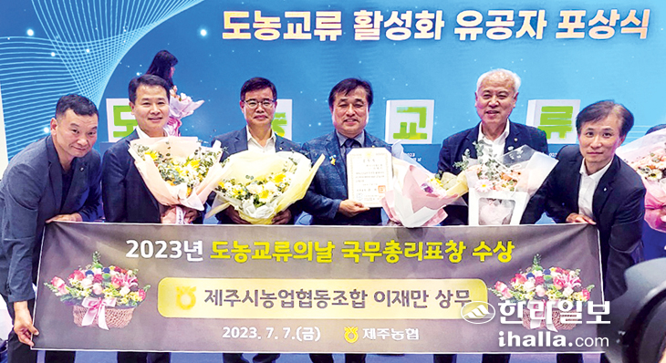 제주시농협 이재만 상무가 지난 7일 경기도 수원메쎄에서 열린 '2023년 도농교류의 날 기념식'에서 농촌발전유공 도농교류 활성화 분야에 기여한 공로로 국무총리 표창을 수상했다. 이재만 상무는 ▷농촌지역 농축협에 매년 도농상생 기금 지원 ▷농업인 실익사업 확대 지원 등의 공로를 인정받았다.