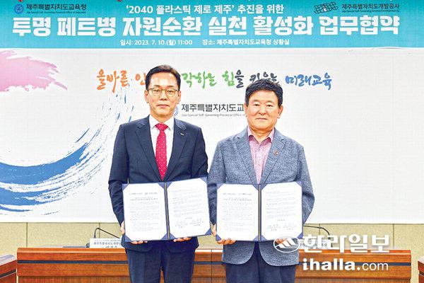 제주도교육청(교육감 김광수)과 제주도개발공사(사장 백경훈)는 10일 도교육청 상황실에서 '2040 플라스틱 제로 제주' 추진을 위한 '투명 페트병 자원 순환 실천 활성화 업무 협약'을 체결했다.