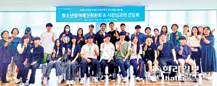 서귀포시는 지난 9일 서귀포시청소년수련관에서 2023년 청소년참여예산제 우수사업 5건을 선정해 시상하고, 청소년참여예산위원과 이종우 서귀포시장과의 간담회를 마련했다. 이날 ▷대정 청소년수련관 '그리노베이션(새활용 체험 교육)' ▷안덕청소년문화의집 '너희들의 미래, 진로체험' ▷서귀포시청소년수련관 '놀멍쉬멍불멍, 힐링캠프' ▷남원청소년문화의집 '우리 밝은 길만 걷자' ▷예래청소년문화의집 '찾아가는 청소년 참여예산학교'사업 등 청소년들의 아이디어가 돋보이는 제안들이 우수사업으로 선정됐다.