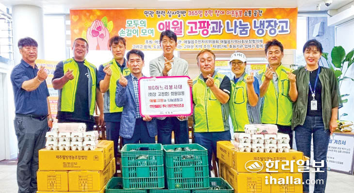 곽지새마을금고 MG하느리봉사대(회장 고정훈)는 지난 6일 제주시 애월읍(읍장 김기완)을 방문해 주민 돌봄 창구인 '애월 고팡과 나눔 냉장고'에 60만원 상당의 식료품을 후원했다. 같은 날 애월읍리사무장협의회(회장 조경자)도 '애월고팡과 나눔냉장고'에 100만원 상당의 식료품을 후원했다.