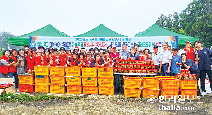 서귀포새마을금고(이사장 윤재순)는 창립 45주년을 기념해 부녀회원과 함께 마늘장아찌 1000여개를 마련해 지난 10일 서귀포매일올레시장 상인들에게 앞치마와 함께 전달했다. 서귀포새마을금고는 자산 3600억원을 달성했고 지난해 장학금 3000만원, 지역사회 환원사업비 4000만원, 지역학교·단체 지원금 1000여만원 등을 지원했다.
