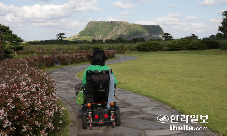 | 휠체어를 타고 제주를 여행하고 있는 윤선 씨. |