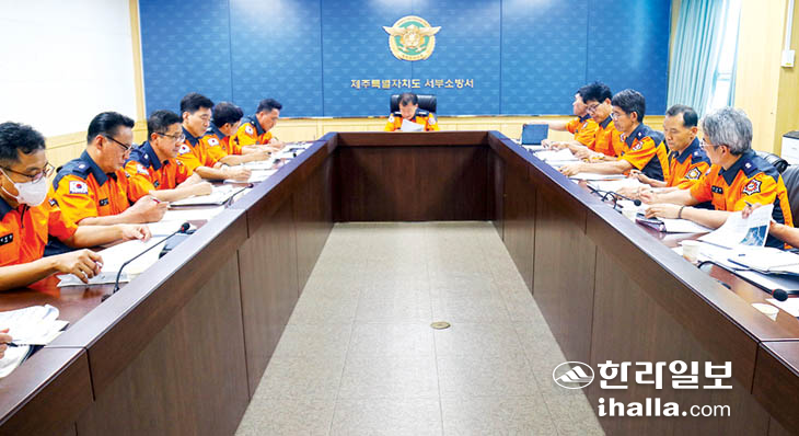 제주서부소방서(서장 고정배)는 지난 14일 소회의실에서 풍수해 대비 선제적 대응대책 강화를 위한 지휘관회의를 실시했다.
