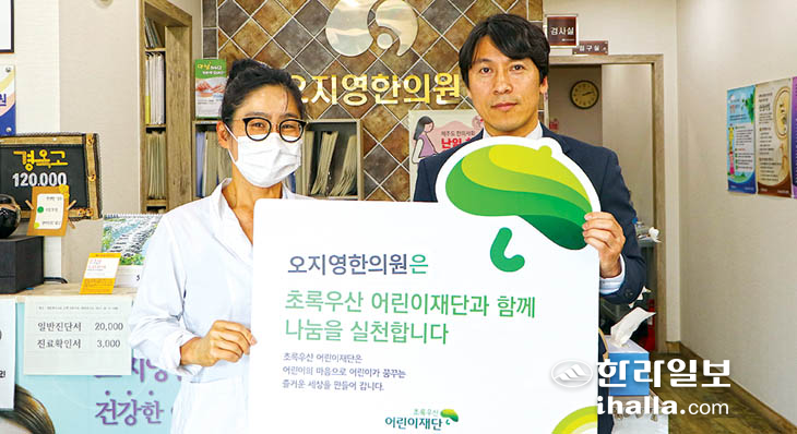 서귀포시 동홍동에 위치한 오지영한의원(원장 오지영)은 지난 14일 초록우산 어린이재단 서귀포시후원회(회장 김미자)와 제주지역본부(본부장 변정근)가 진행하는 나눔릴레이 캠페인에 동참하고 나눔현판을 전달받았다.