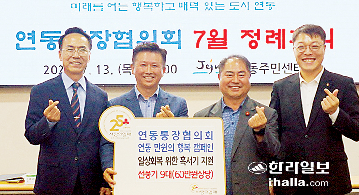 연동통장협의회(회장 김상현)는 지난 13일 연동주민센터에서 일상회복을 위한 혹서기 지원 선풍기 9대를 제주사회복지공동모금회(회장 강지언)에 기탁했다.