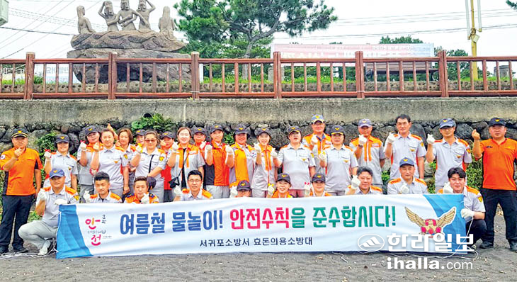 서귀포소방서 효돈의용소방대(남성대장 강갑훈·여성대장 오금숙)와 효돈119센터(센터장 김영삼)는 지난 15일 쇠소깍 일대에서 여름철 물놀이 안전사고예방 캠페인 및 자연정화활동을 실시했다.