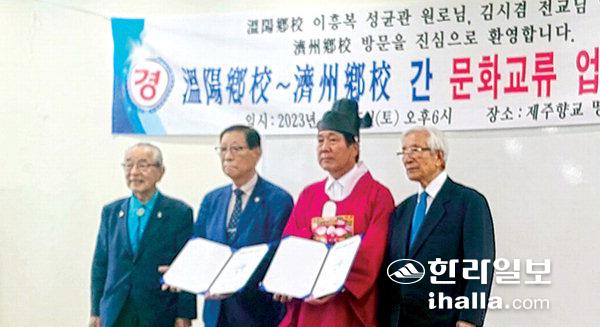 제주향교(전교 진인수)와 충남 아산시 온양향교(전교 김시겸)는 지난 15일 제주향교 충효관에서 문태수 원로회장 및 유림 50여 명이 모여 양쪽 향교의 발전을 도모하고 문화사업 창달에 앞장서는 계기를 마련하고자 업무협약식을 체결했다.