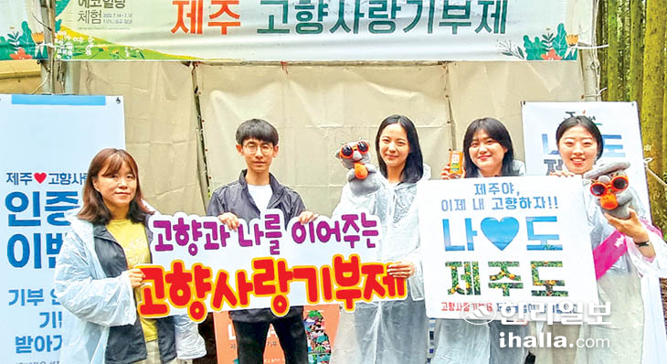 제주특별자치도와 제주농협(본부장 윤재춘)은 지난 14일 '제15회 사려니숲 에코힐링 체험행사'가 열리는 사려니숲길 정책홍보관에서 고향사랑기부제 홍보 캠페인을 벌였다. 사려니숲 탐방객을 대상으로 리플릿과 홍보 스티커가 부착된 제주감귤주스를 나눠주며 고향사랑 기부 방법과 혜택을 안내하고, 기부에 동참해 줄 것을 당부했다.