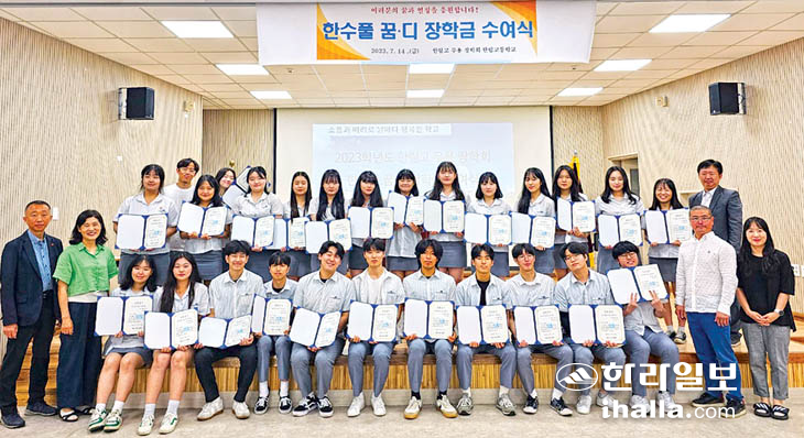 한림고등학교(교장 김평희)는 지난 14일 한빛관에서 '2023학년도 1학기 한수풀 꿈·디 장학증서 전달식'을 실시했다. 이날 행사에서는 총 25명에게 각 20만원의 장학금을 지급했다.