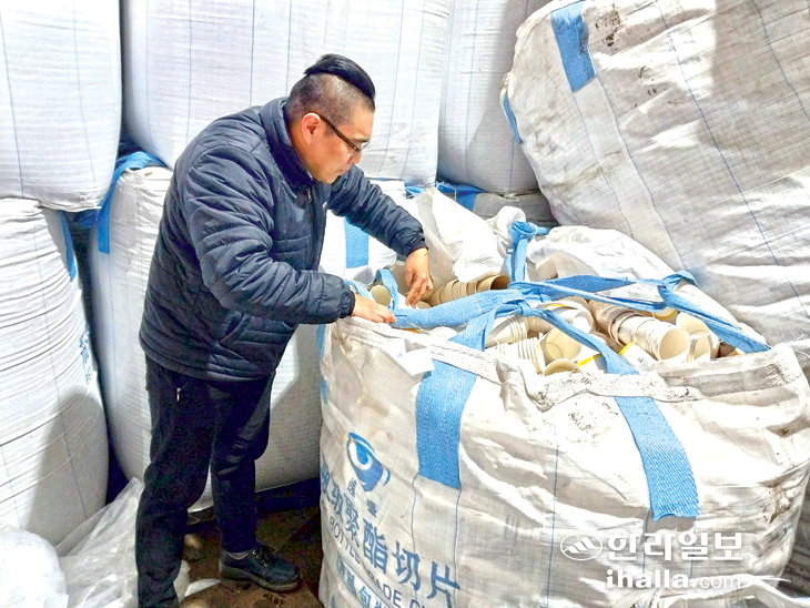 제주시 구좌읍 소재 폐기물 처리업체가 선별해 보관중인 일회용컵을 살펴보고 있는 모습. 한라일보 DB