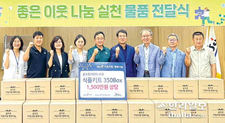 골프존카운티 오라골프장은 18일 제주시 오라동(동장 장옥영)을 찾아 물품 전달식을 열고 관내 취약계층을 위해 사용해달라며 1500만원 상당의 식품키트 350상자를 전달했다.