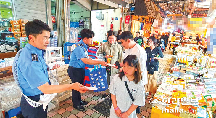 이에 제주해경은 동문시장에서 여름철 물놀이 시 연안사고 예방을 위해 지켜야 할 안전 수칙을 홍보하고 구명조끼 입기 중요성을 강조하는 홍보물을 배포했다.