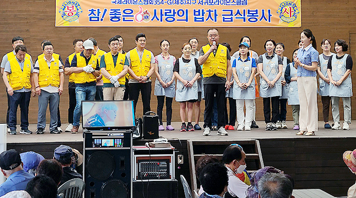 서귀포라이온스클럽(회장 김대윤)라이온과 부인회원 40여명은 지난 18일 서귀포 매일시장 아케이트상가 야외공연장에서 어르신과 취약계층을 모시고 서귀포시 자원봉사센터와 함께 참좋은 사랑의 밥차 급식 봉사를 실천했다.