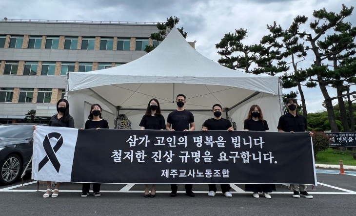 제주교사노조는 "동료 교사들은 고인이 '평소 속이 깊고 힘든 일을 내색하지 않고 묵묵히 학교생활을 해왔다'고 했다"며 "고인의 죽음은 학부모의 민원을 오롯이 담임교사 혼자 감당해야 하는 현재의 제도와 무관하지 않은 것으로 전국의 교사들은 참담한 심정"이라고 말했다.