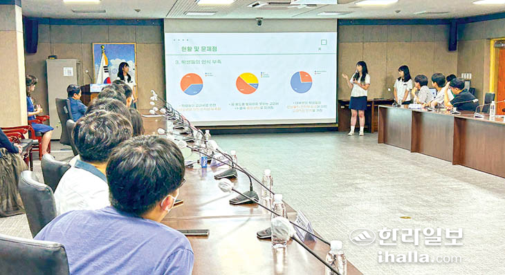 제주도교육청은 '청소년이 만드는 기후 위기 대응 정책'을 주제로 마련한 2023년 제2회 교육정책토론회를 지난 6월 3일부터 7월 22일까지 총 12차시에 걸쳐 운영했다. 이번 토론회는 도내 고등학교 1~2학년 중 신청 학생 20명을 대상으로 기후 위기와 정책에 대한 이론 강의, 관련 도서 읽기, 토의와 토론, 제안서 작성, 발표로 진행됐다.