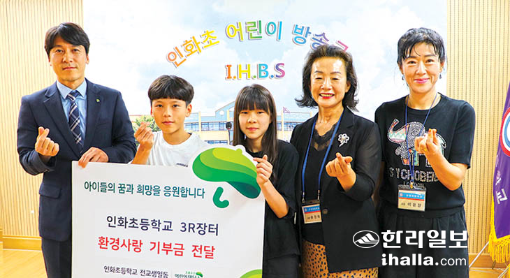 인화초등학교(교장 윤정애) 학생들은 지난 21일 기후위기환경보호 캠페인의 일환으로 전교생이 참여한 '3R장터'를 진행하고 수익금 32만원을 환경보호를 위한 기부금으로 초록우산 어린이재단 제주지역본부(본부장 변정근)에 전달했다. 이날 수익금은 도내 취약계층 아동가정에 에어컨 구입비로 전달될 예정이다.