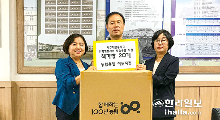 제주제일중학교(교장 윤철훈)는 지난 24일 농협은행 이도지점(지점장 좌순양)으로부터 '취약계층 자녀 학습용품 지원' 사업과 연계해 책가방 20개를 기증받았다.