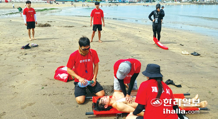 이날 훈련은 오는 28일부터 30일까지 3일간 열리는 이호테우축제 기간에 많은 이용객이 찾을 것을 대비해 해수욕장 익수자 발생 시 인명구조 및 응급처치 방법 등의 내용으로 이뤄졌다.