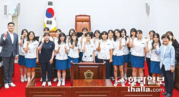 제주특별자치도의회(의장 김경학)는 26일 본회의장에서 제주중앙여자고등학교 1~2학년 학생 23명이 참여한 가운데 청소년 모의의회 의정체험을 운영했다.
