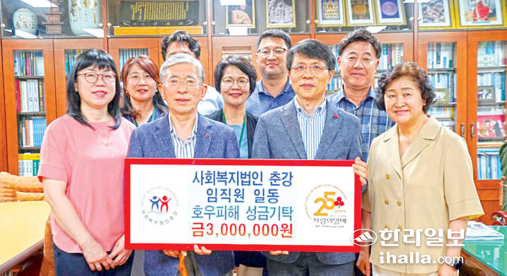 사회복지법인 춘강(이사장 이동한) 임직원 일동은 지난 25일 춘강 법인 사무실에서 집중호우로 피해를 입은 이웃들을 돕기 위한 성금 300만원을 제주사회복지공동모금회(회장 강지언)에 기탁했다.