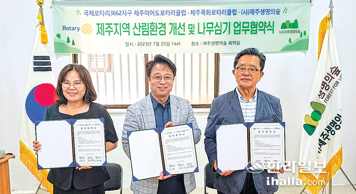 국제로타리 3662지구 제주 이어도로타리클럽(회장 박기진), 제주 목화로타리클럽(회장 김순애), (사)제주생명의숲(상임대표 고윤권)은 지난 25일 제주생명의숲 회의실에서 산림환경 개선을 위한 업무협약을 체결했다.
