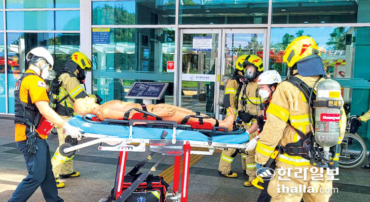 이번 훈련은 실제 재난상황 발생 시 신속 대응을 위해 제주대학교병원 자위소방대와 합동으로 화재상황을 가정해 화재진압훈련과 인명대피훈련을 진행했다.
