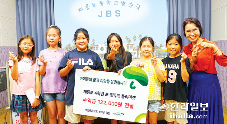 재릉초등학교(교장 강미숙) 4학년 학생들이 지난 24일 '과거 우리 마을은' 프로젝트 플리마켓 수익금 12만2000원을 초록우산 어린이재단 제주지역본부(본부장 변정근)에 전달했다.