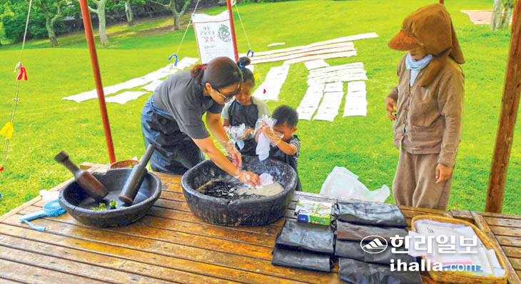 제주민속촌은 피서철을 맞아 관람객을 대상으로 지난 28일부터 '과랑과랑한 벳듸 감물들염수다' 체험 행사를 진행하고 있다. 이번 체험 행사에선 도고리(물건 담는 도구)와 마께(나무방망이)를 이용한 전통방식을 볼 수 있으며, 손수건 감물 들이기 체험을 할 수 있다.