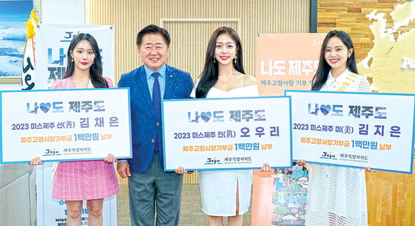 2023미스제주 진·선·미 수상자인 오우리(25), 김채은(23), 김지은(25)씨는 지난 28일 오영훈 제주지사 집무실을 방문해 제주고향사랑기부제 응원과 함께 기부금을 전달했다. 이들은 대회 수상금으로 받은 100만 원을 각각 기부했다.