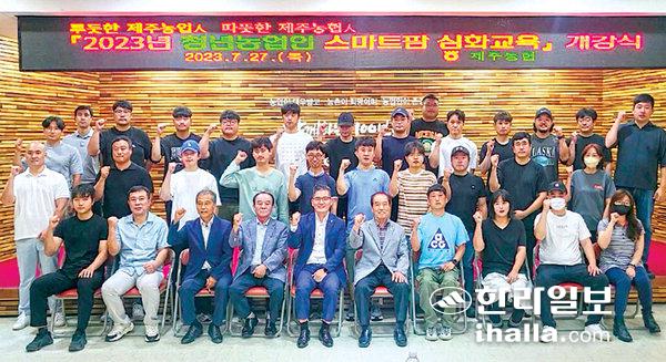 농협제주본부(본부장 윤재춘)와 제주농협운영협의회(의장 김성범), (사)한국새농민제주특별자치도회(회장 정재훈)는 지난 27일 농협제주본부 대회의실에서 교육생 40명이 참석한 가운데 '2023년 청년농업인 스마트팜 심화교육' 개강식과 첫 교육을 실시했다. 이 과정은 미래 농촌의 주역인 청년농업인을 대상으로 스마트팜 전문교육 기회를 제공하기 위한 과정으로, 제주농협과 새농민회가 협업해 올해 처음 개설했다.