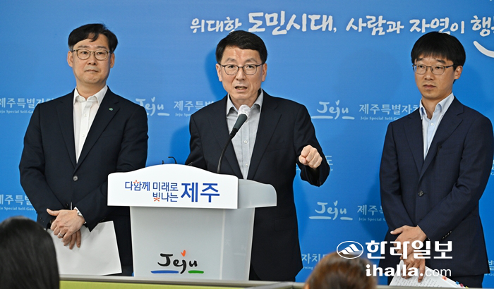 | 대규모 그린수소 생산 실증 시설사업 유치를 발표하는 김성중 제주자치도 행정부지사(가운데). 강희만 기자 |