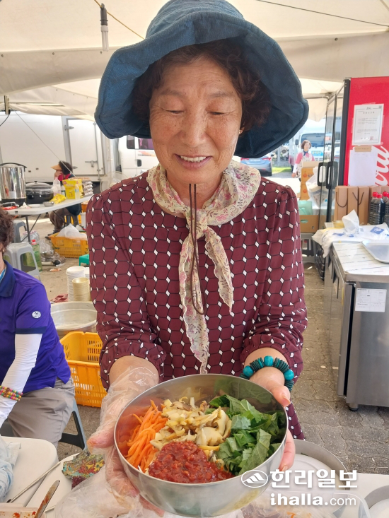 | 제주 금능바다에서 물질하는 해녀 고덕심 씨가 뿔소라를 넣은 비빔밥을 만들어 보여주고 있다. 김지은기자 |