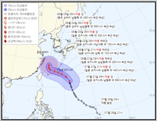 이어 내달 4일 오전 9시쯤 중심기압 960hPa, 최대풍속 초속 39m로 강한 세력을 유지한 채 중국 상하이 남남동쪽 약 560km 부근 해상에 진출한 뒤 북상할 것으로 예상된다.