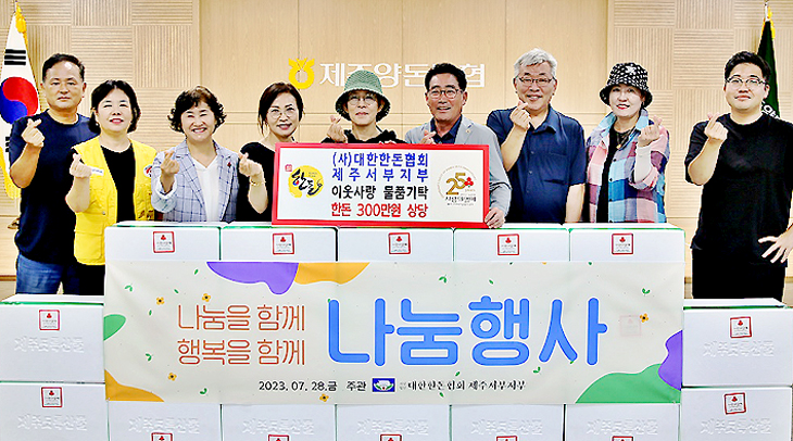 (사)대한한돈협회 제주서부지부(지부장 김진삼)는 지난달 28일 제주시 한림읍 소재 제주양돈농협 한림지점에서 300만원 상당의 이웃사랑 한돈 190㎏(한돈 300만원 상당)을 제주사회복지공동모금회(회장 강지언)에 기탁했다.