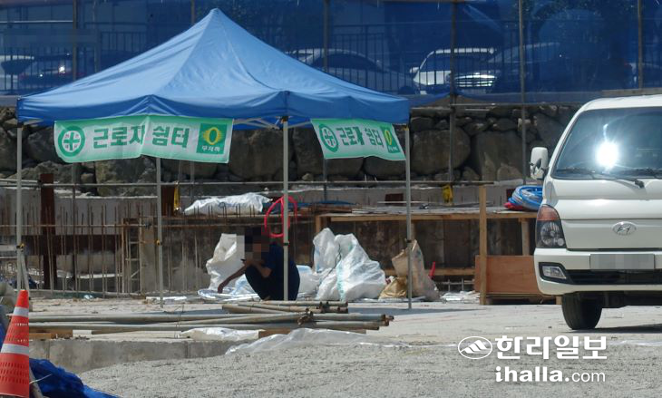 | 제주시의 한 공사 현장에 설치된 근로자 쉼터 천막. |