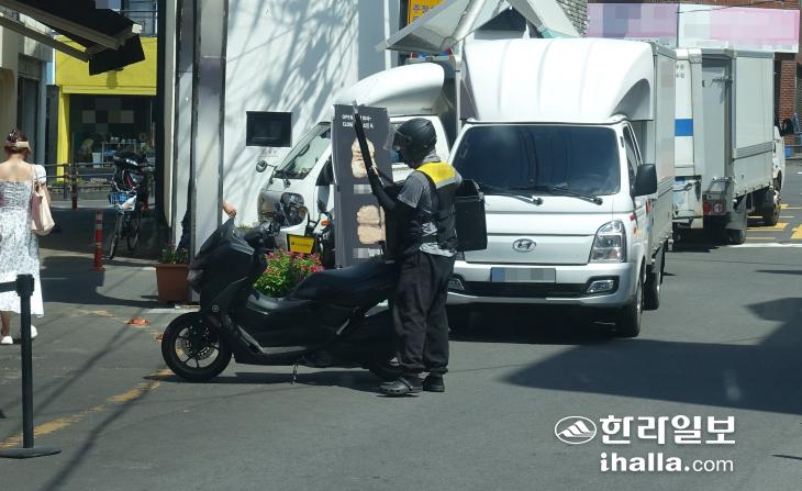 7일 오전 제주시 이도일동에서 만난 40대 배달 기사 A 씨는 헬멧 사이로 흐르는 땀을 연신 닦아내고 있었다. 여름용 토시와 아이스팩 등이 들어있는 조끼로 무장했지만 하루 종일 도로를 누벼야 하는 배달 기사들에게는 더위와의 싸움이 녹록지 않다.