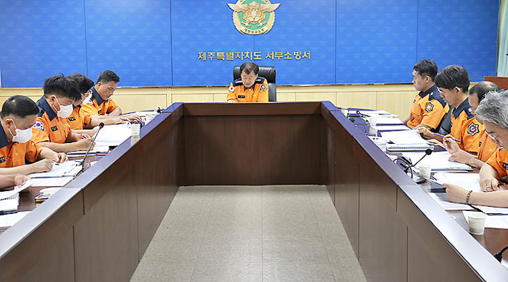 제주서부소방서(서장 고정배)는 지난 7일 제6호 태풍 '카눈' 북상에 대비한 긴급 대응태세 점검 회의를 개최했다.