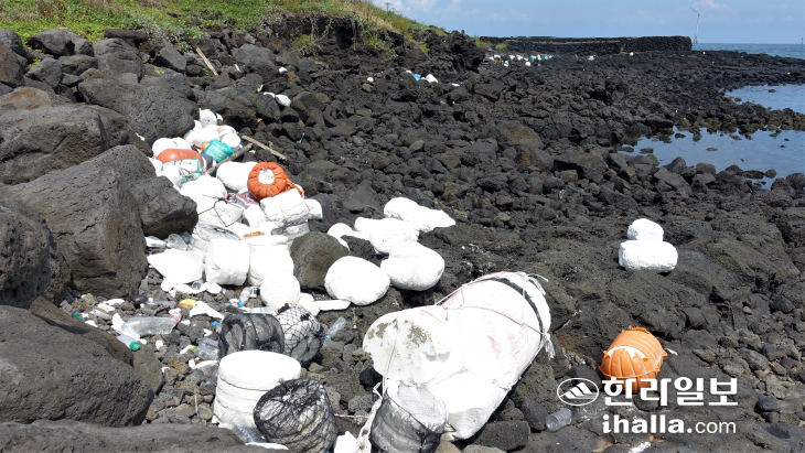 11일 구좌읍 해안 갯바위 등 폐어구·부표 등 쓰레기 가득