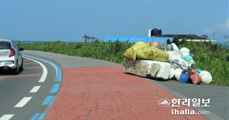 | 11일 제주시 구좌읍 해안에서 수거돼 도로에 쌓여있는 해양쓰레기. |
