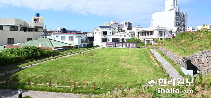 ▶원도심 역사공원으로 살아난 '제주성 군사지휘소'="조선 명종 10년(1555) 을묘왜변 때 전라도 영암 등 남해안에 침공했다가 쫓긴 왜구 1000여 명이 같은 해 6월 27일 40여 척의 적선에 나눠타고 화북포로 침입, 제주성을 공격하면서 3일간의 치열한 전투가 벌어졌다. 제주목사 김수문이 지휘하는 효용군 70여 명과 김직손, 김성조,이희준, 문시봉이 말을 타고 돌격(馳馬突擊)하는 등 크게 활약하고 정병 김몽근이 화살로 적장을 쓰러뜨려 패퇴시켜 을묘왜변 제주대첩을 완성하였다. 제주 군관민의 기개와 일체심을 동력으로 왜구를 격퇴한 빛나는 승전의 역사인 을묘왜변 제주대첩을 후세에 널리 알리고자 이 비를 세운다."