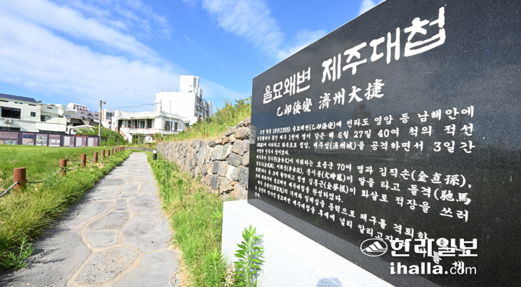 [한라일보] 제주시 동문시장 공영주차장 방면으로 꼬리를 물고 이어지는 차량들을 지나 언덕배기에 오르면 도심 안에 자리 잡은 공원 하나가 보인다. 2022년 조성된 운주당지구(運籌堂地區) 역사공원이다. 원도심의 높다란 건물들 사이로 제주 바다가 눈에 들어오는 제주시 일도1동 1108번지 운주당지구에 '을묘왜변 제주대첩' 빗돌이 있다. 제주대첩의 역사적 의미를 드러내는 논의가 잇따르면서 지난해 말 제주도 명의로 제작한 것이다. 제주성을 무너뜨리고 이 섬을 손 안에 넣기 위한 왜구들의 배가 도착했던 화북포구에 표지석이 있다면 운주당지구엔 기념비가 놓였다. 제주대첩에 얽힌 이야기를 품은 곳이 하나둘씩 생겨나고 그날의 기억들을 전하기 위한 활동들이 늘고 있는 만큼 이것들을 한데 묶고 이으며 제주사회로 퍼뜨리는 일에 힘을 모아야 할 때다.