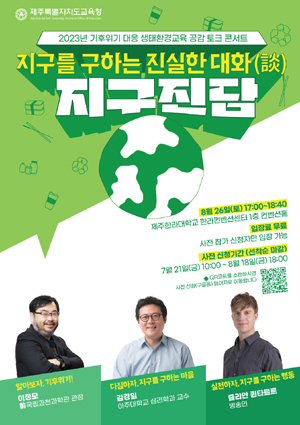 제주도교육청은 이달 26일 오후 5시 제주한라대 한라컨벤션센터 1층 컨벤션홀에서 2023년 기후위기 대응 생태환경교육 공감 토크 콘서트로 '지구를 구하는 진실한 대화'(약칭 '지구진담')를 운영한다.