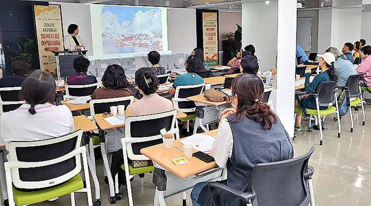 (사)서귀포YWCA(회장 고맹수)는 23일 '2023 서귀포시행복드림아카데미-50+인생학교' 가을학기 개강식 및 인생설계 과정을 30여 명이 참여한 가운데 서귀포YWCA회관에서 개최했다.