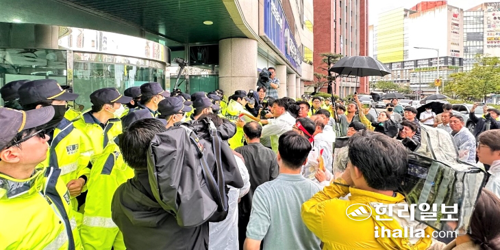 기자회견 이후 항의 서한을 전달하겠다며 진입을 시도하는 윤석열정권퇴진·한국사회대전환제주행동 관계자들을 경찰이 제지하고 있다.
