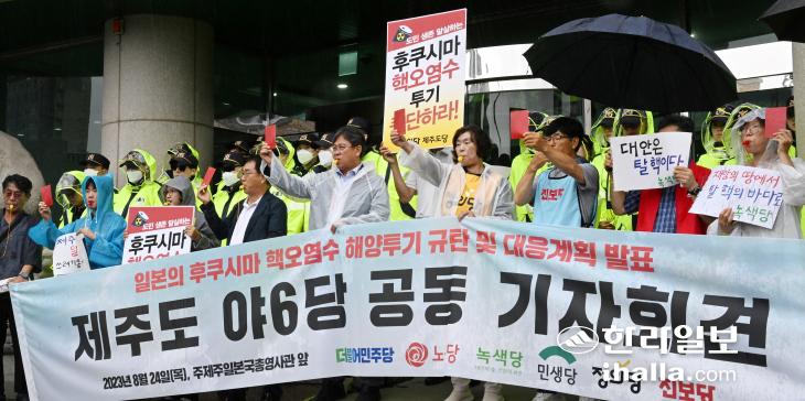 노동당·더불어민주당·민생당·정의당·진보당 제주도당, 제주녹색당 등 제주도 야6당은 24일 오전 제주시 노형동 일본총영사관 앞에서 기자회견을 열고 "오늘부터 시작되는 일본 정부의 후쿠시마 핵오염수 해양 투기를 강력 규탄한다"며 "일본 정부의 행위는 자국의 문제 해결을 위해 전 세계에 재앙을 퍼트리는 희대의 해양 범죄로 제2차 세계대전 이후 또다시 범죄국가의 길로 들어서는 것이나 다름없다"고 말했다.