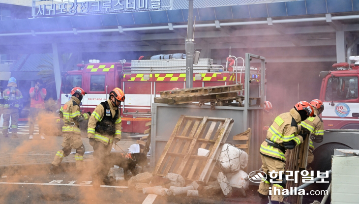 [한라일보] 대규모 재난을 대비한 긴급구조 종합훈련이 서귀포시 강정항크루즈터미널에서 실시됐다.