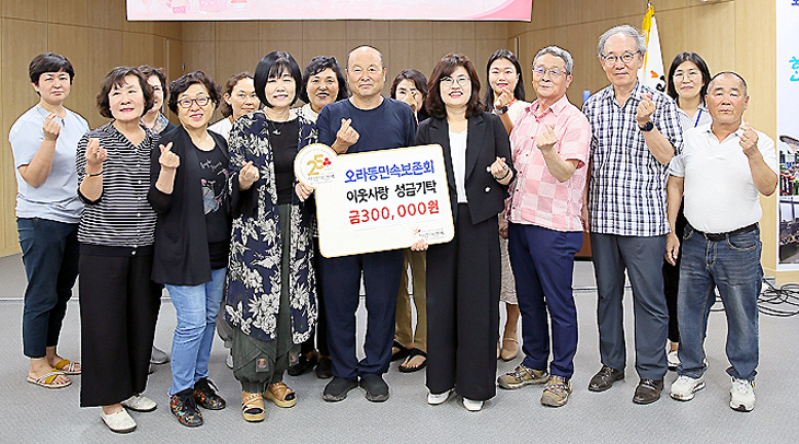 오라동민속보존회(회장 문명숙) 회원일동은 지난 22일 오라동주민센터(동장 장옥영)에서 이웃사랑 성금 30만원을 제주사회복지공동모금회(회장 강지언)에 기탁했다.
