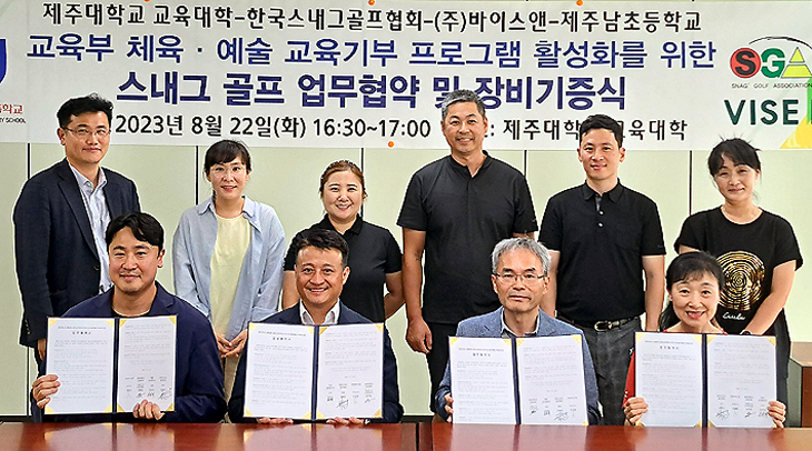 제주대학교 교육대학(부총장 김희필)과 제주남초등학교(교장 김진희), 한국스내그골프협회(회장 김형달), 바이스앤(전무이사 인승철)은 지난 22일 업무협약식 겸 장비기증식을 개최했다.