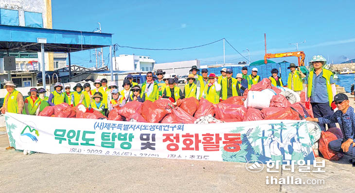 사단법인 제주특별자치도생태연구회(회장 조재홍) 회원 40여명은 최근 슴새 및 흑비둘기 번식지로서 섬 전체 천연기념물로 지정돼 있는 추자면 사수도와 청도를 현지 방문해 해안 폐어구 및 스티로폼 등 해안 쓰레기 수거 자연정화 활동을 실시했다.